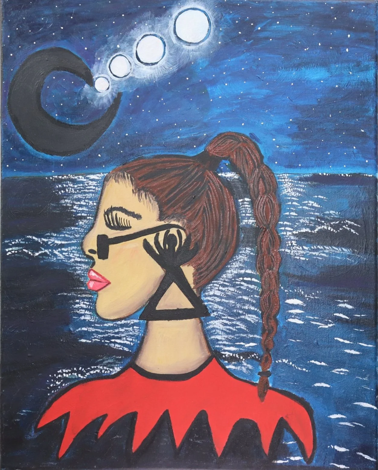 As the artist grapples with the intricacies of their own identity, the moon's celestial presence becomes a guiding force, casting a serene yet probing gaze upon the subject.