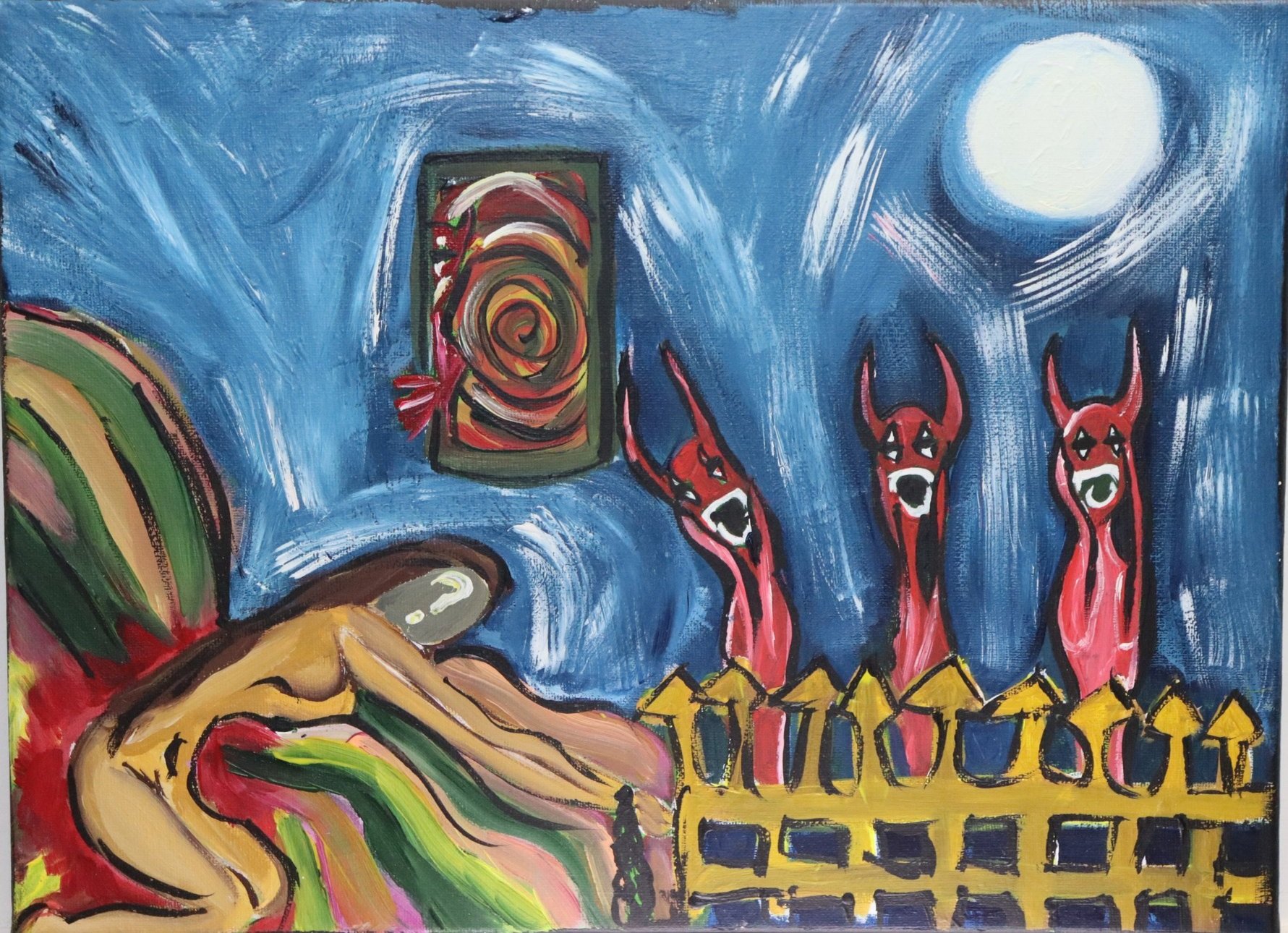 The painting "Nightmares Unleashed" delves into the depths of the human psyche, unraveling the intricate web of recurring nightmares and the profound influence of fear on both conscious and subconscious levels.