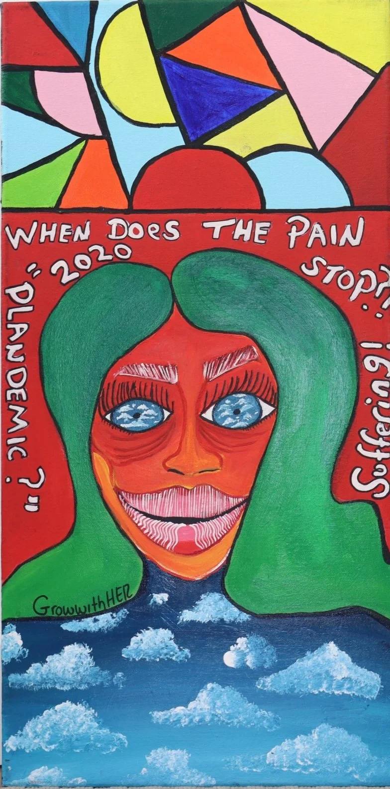 The artist's self-portrait is rendered in fragmented, disjointed strokes, symbolizsing the shattered sense of self and profound internal conflict they grappled with, evoking the spectrum of feelings unleashed by the pandemic's upheaval