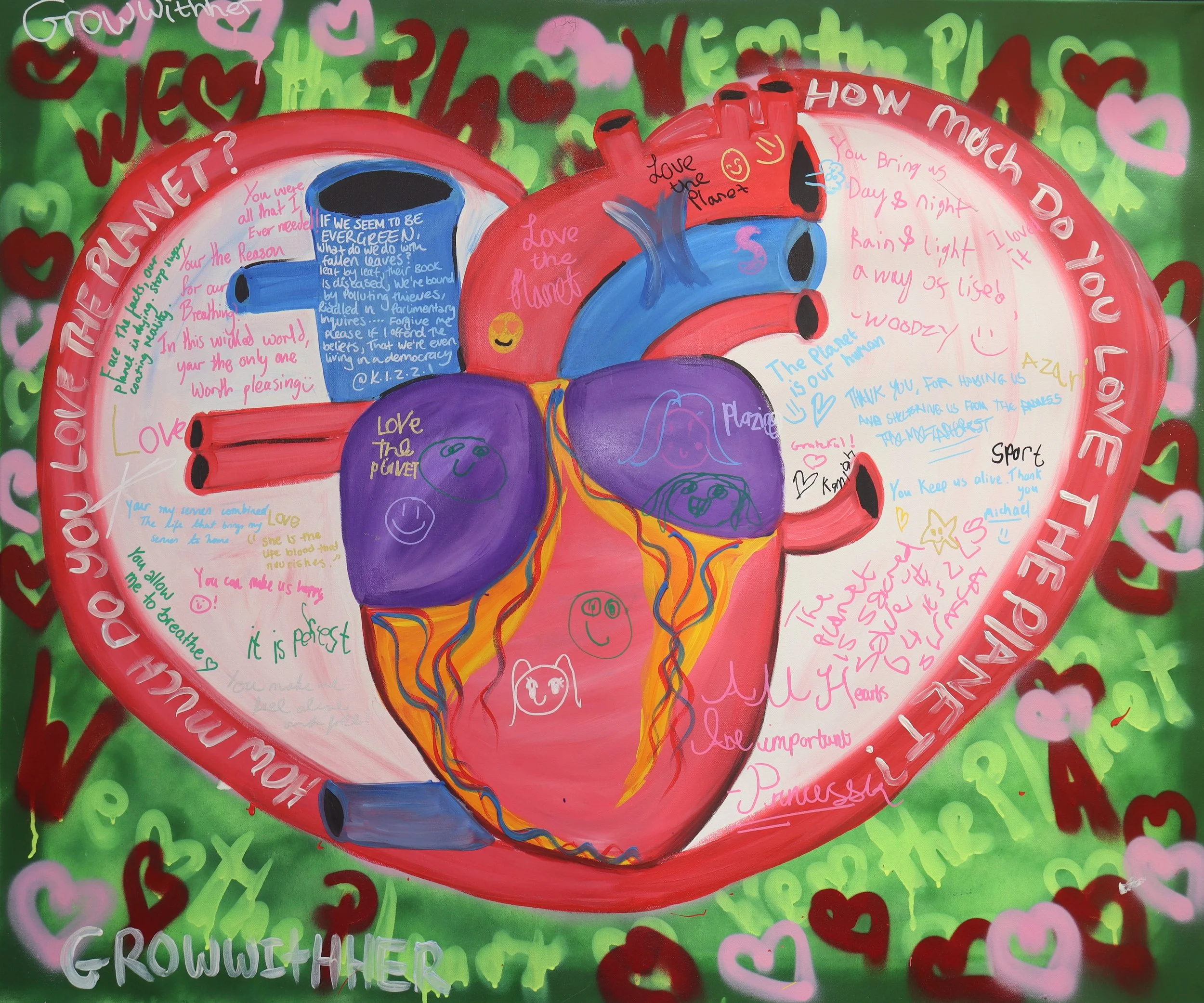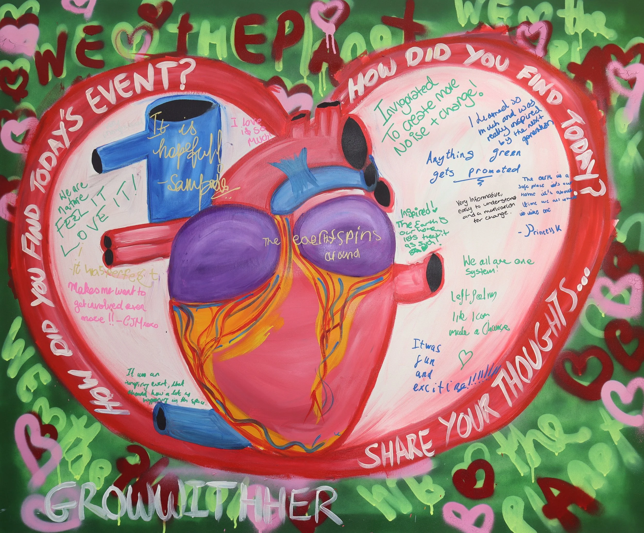 Working together with The Mayor’s Peer Outreach Team, Royal Holloway University of London, and The Museum of London, I created three canvases for a special event focused on climate change for young Londoners. One of the canvases was displayed, while the other two were made available for the attendees to interact with. The purpose of the canvases was to collect the thoughts and ideas of the attendees regarding the event itself and the planet's situation. It was fascinating to witness the wide variety of thoughts that were contributed by the attendees to the canvases.
