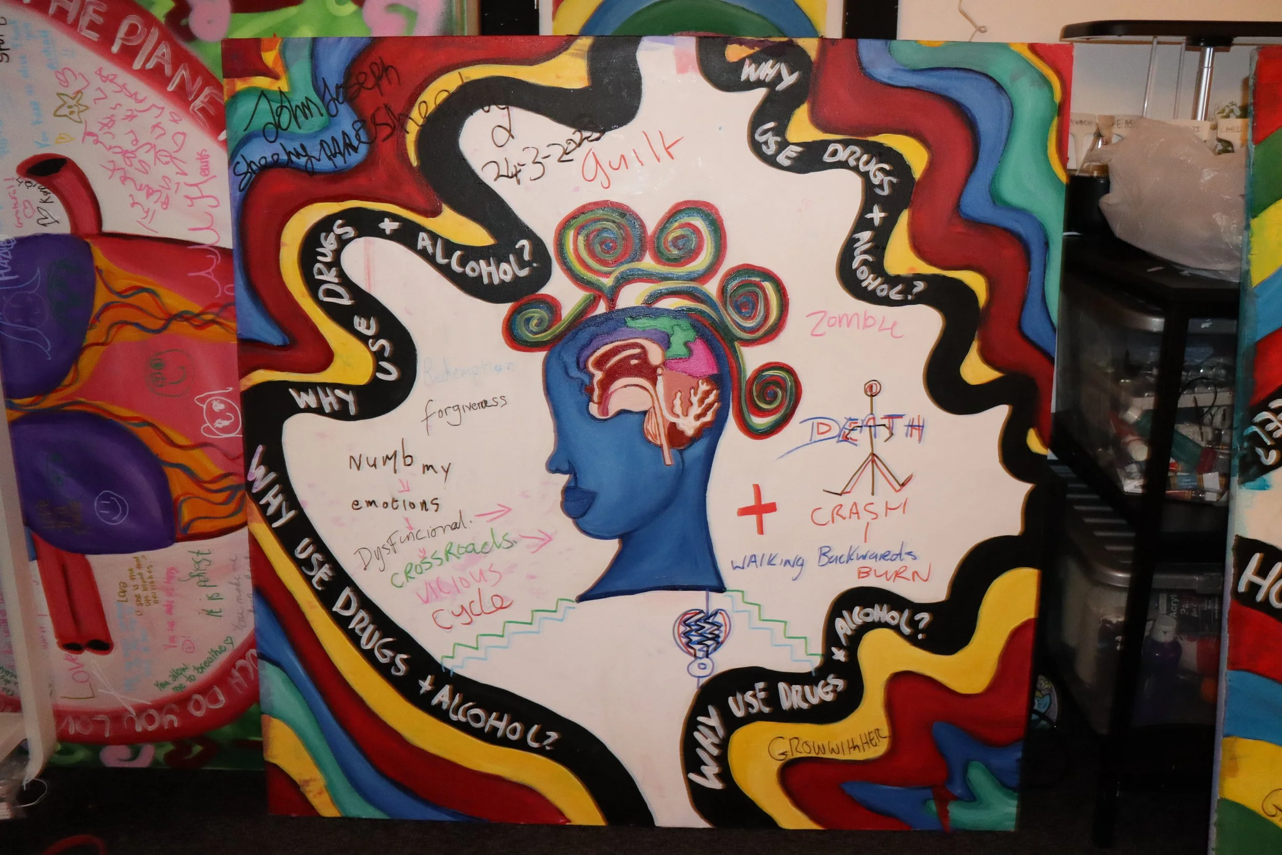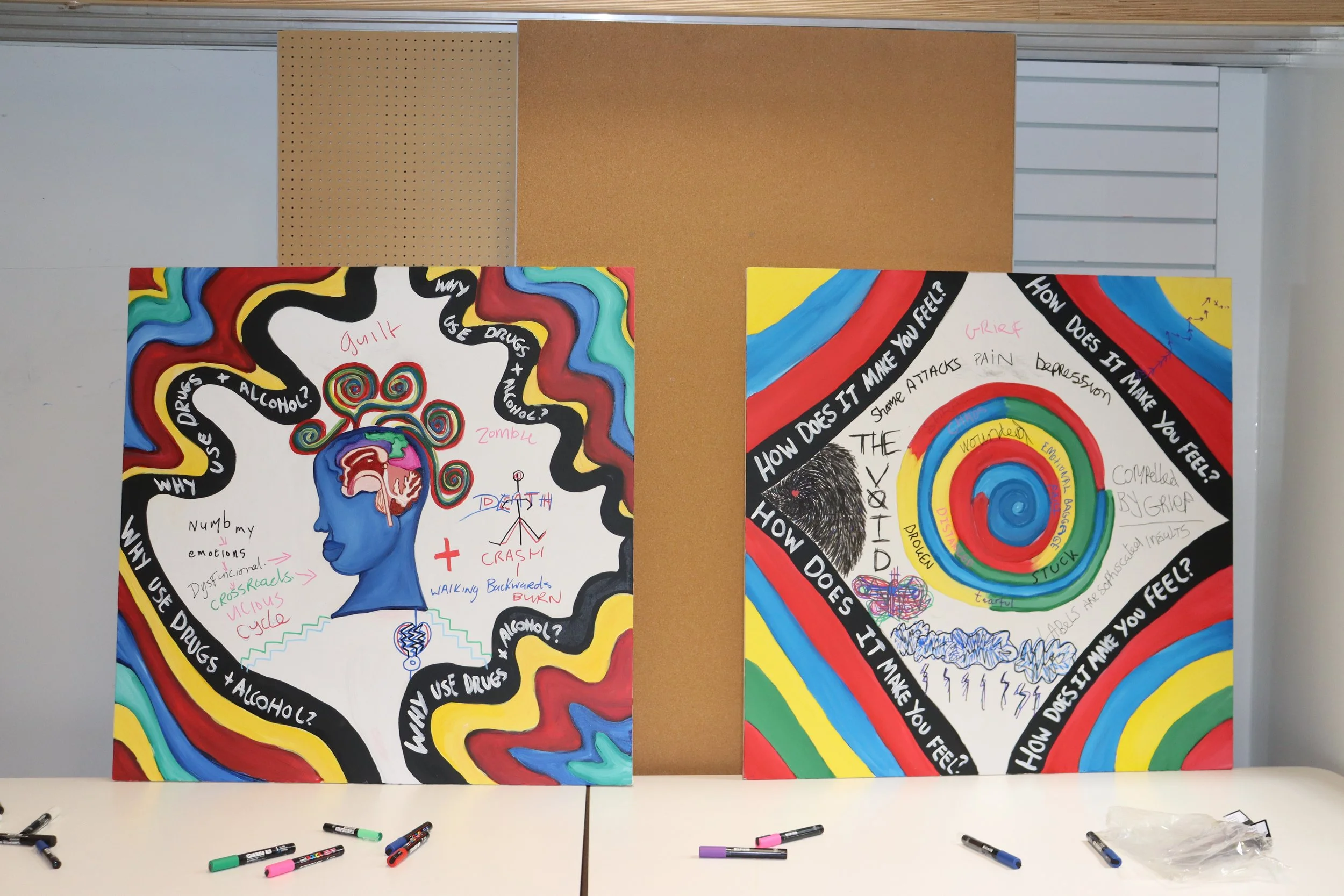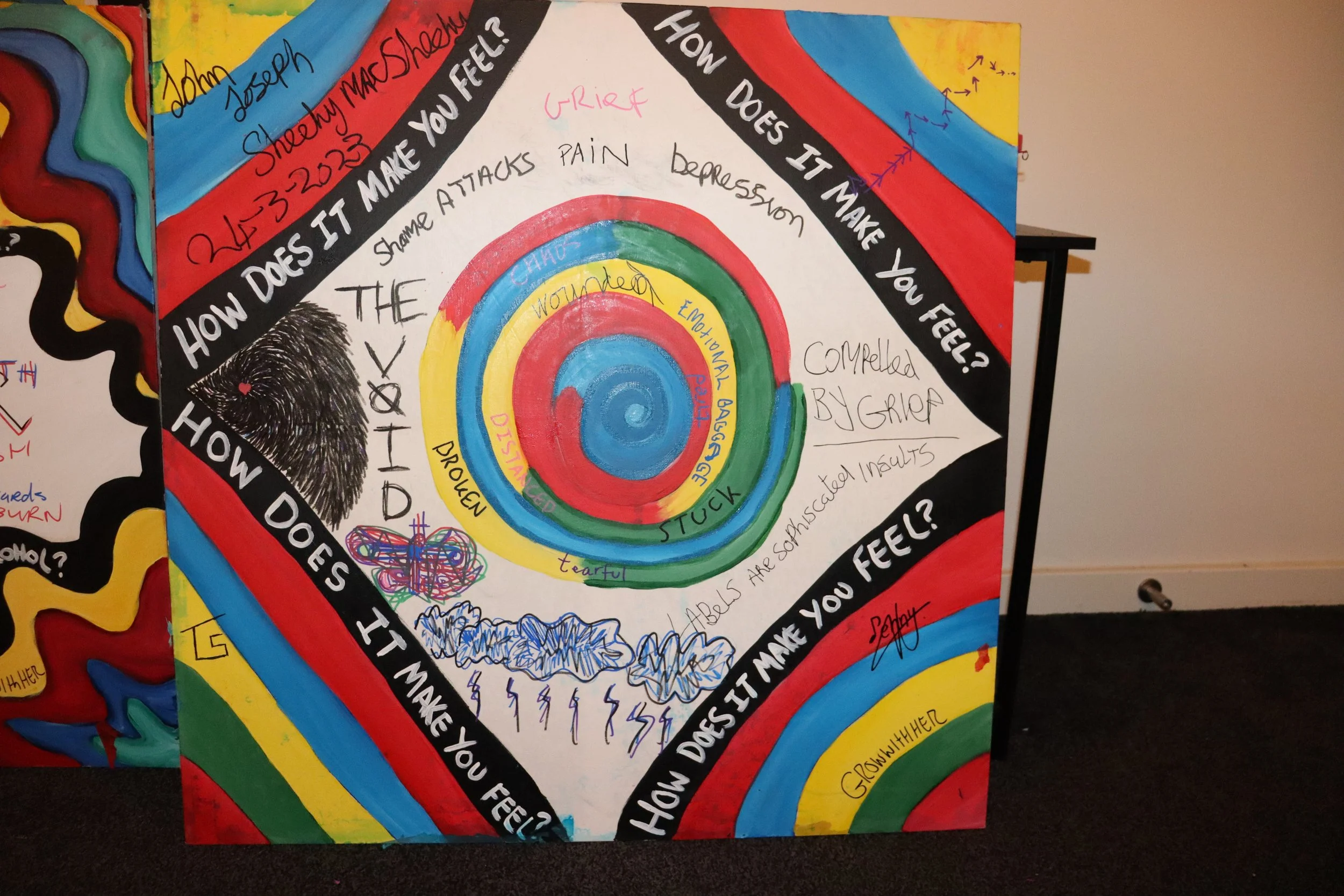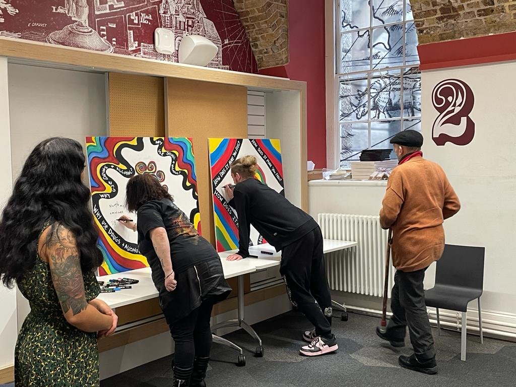 In June 2022, I prepared two blank artworks for Thrive LDN's event promoting the Right to Thrive Program. The goal was to help and empower London's community organizations. The artworks served as a platform for participants to contribute ideas on collaboration and community.