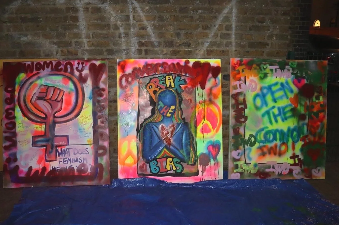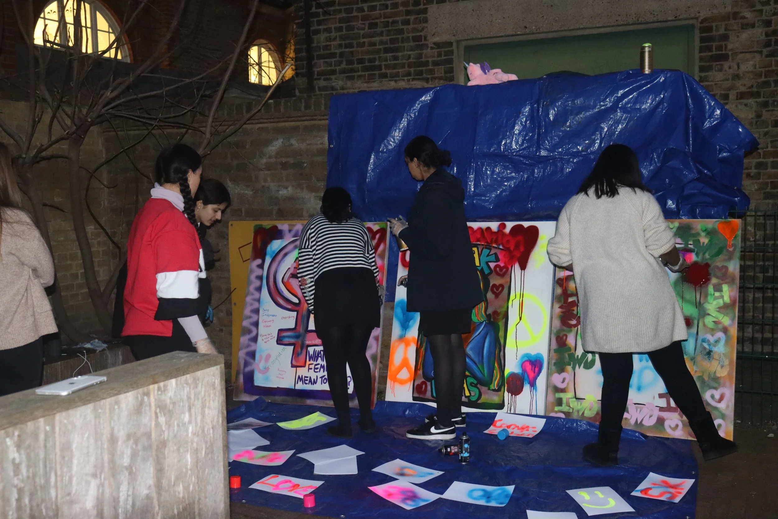 In March 2022, I worked with St. Hilda's Girls Project group to address gender inequality and feminism. Using pre-prepared canvases, we discussed the topics and encouraged group interaction. Collaborative canvases were created, which displayed our explored areas. To finish the artwork, we took the canvases outside and added spray paint. This successful engagement method allowed participants to express emotions, ideas, and be creative.