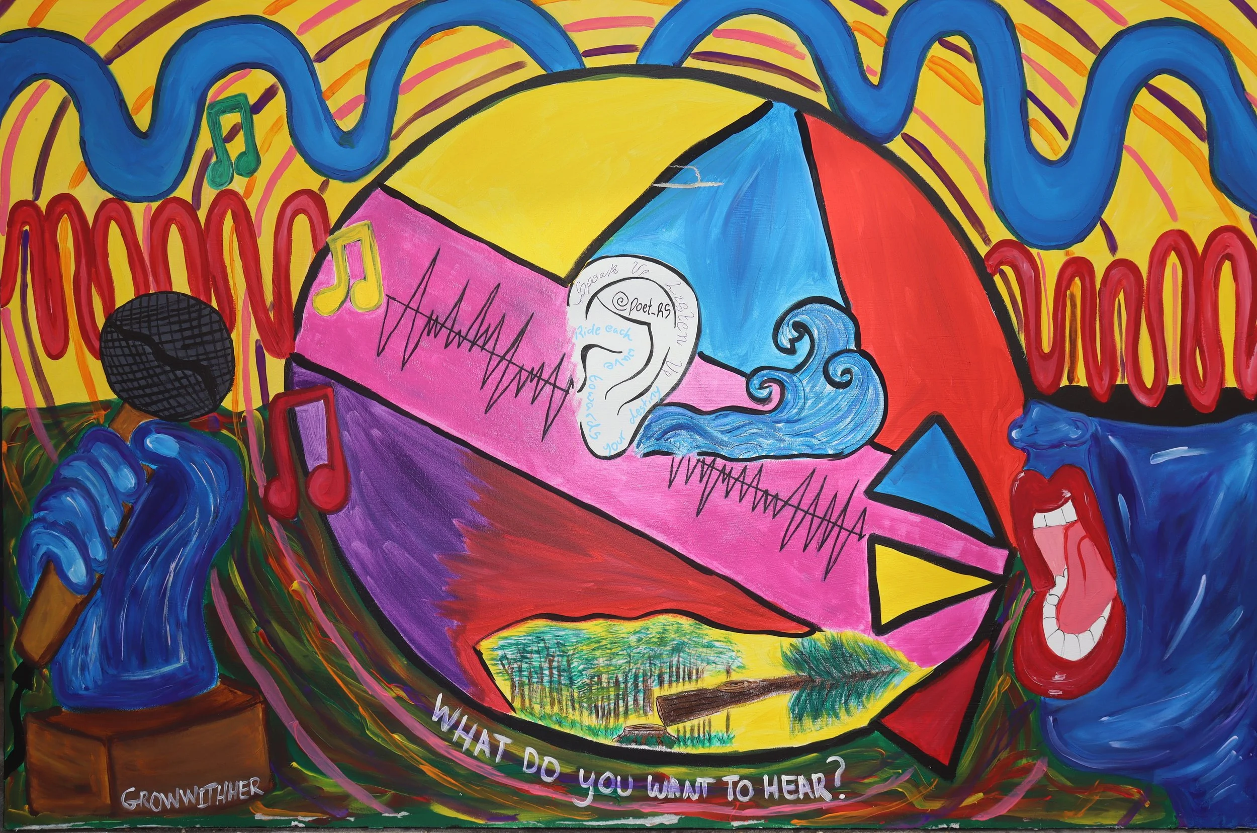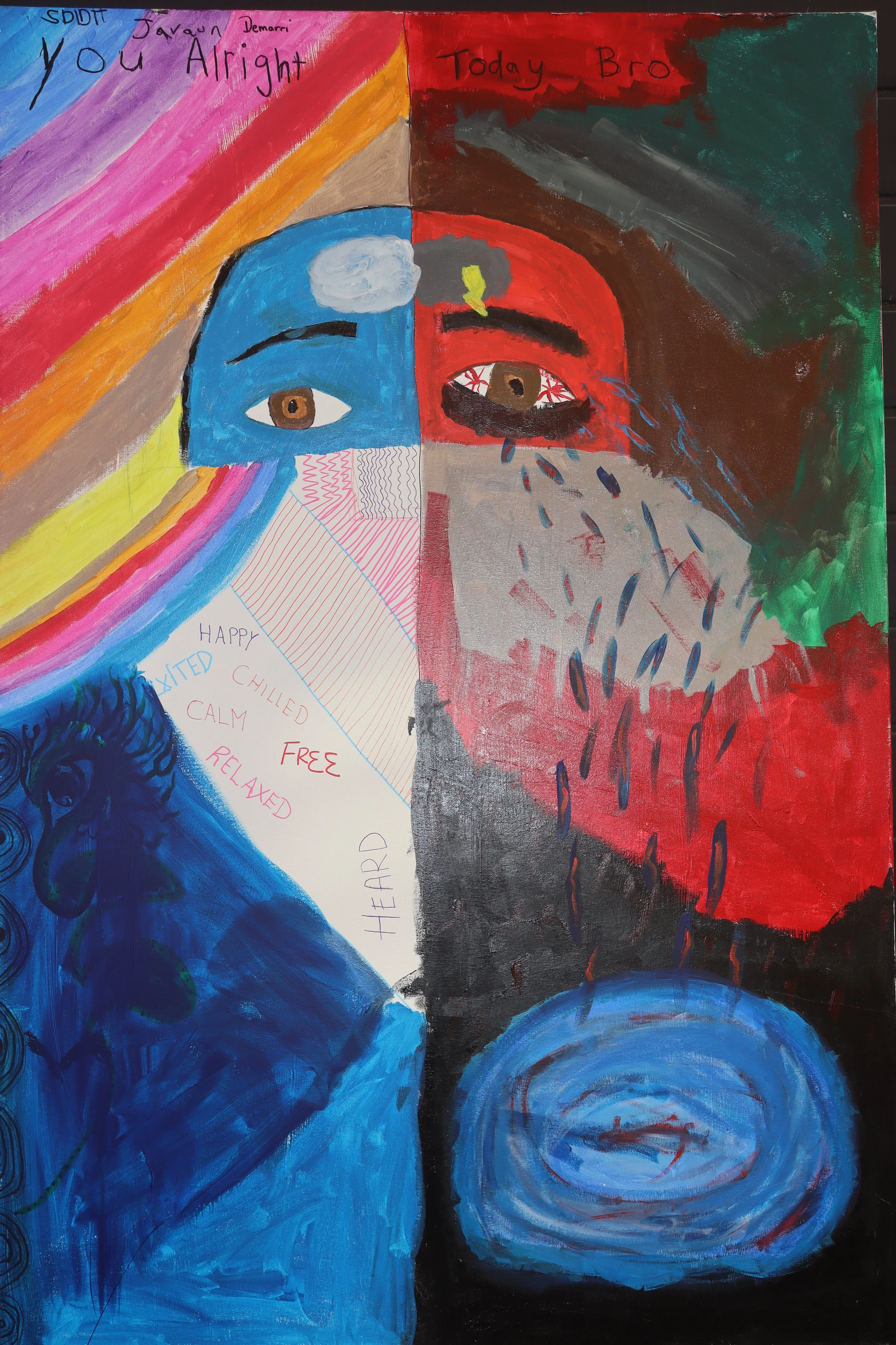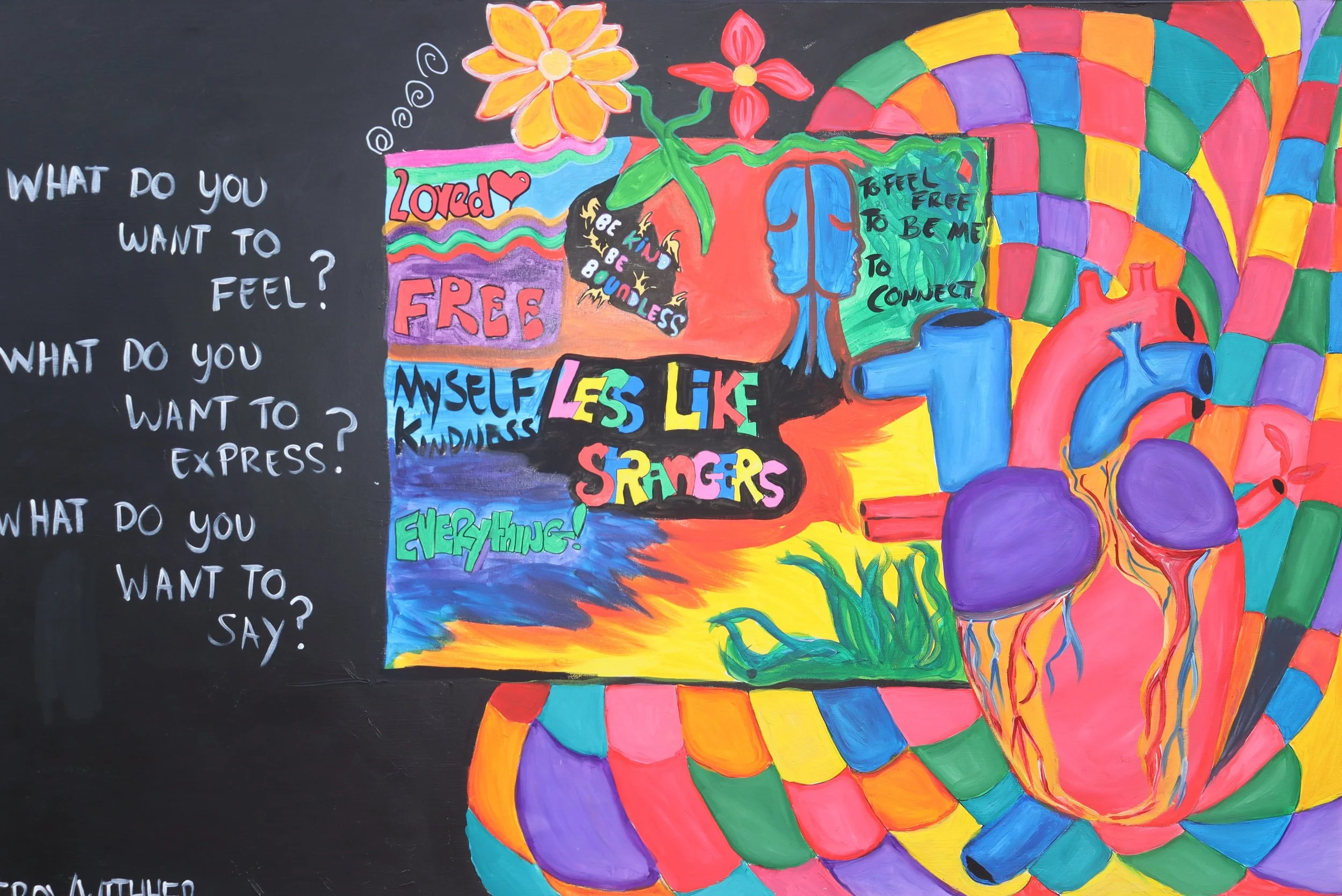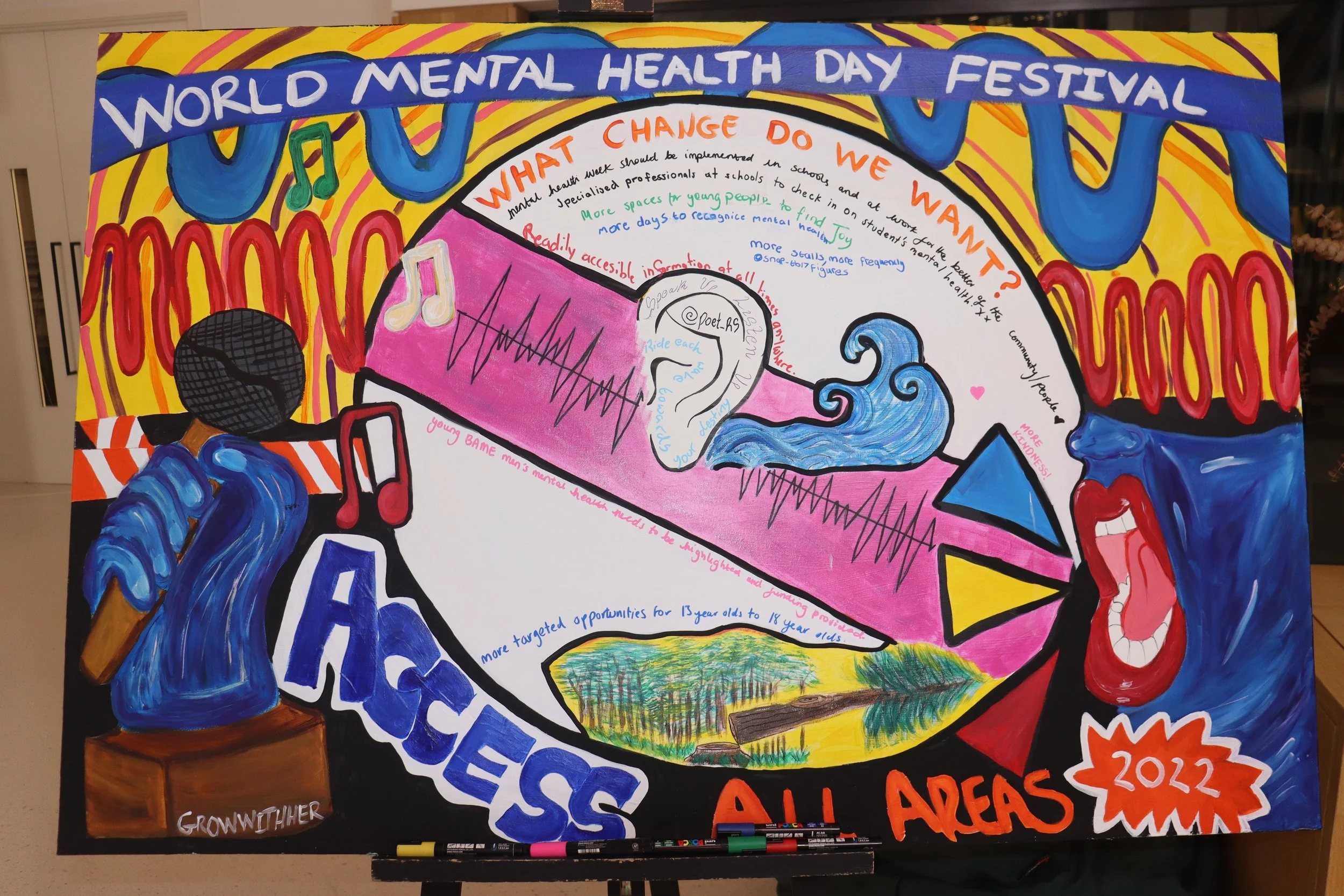 Thrive LDN's World Mental Health Day Festival featured collaborative canvases where attendees contributed ideas and artwork. Young people had a separate canvas to create their own art. All pieces were displayed on the festival's last day. In 2022, redesigned canvases aligned with the event's branding and allowed people to share their thoughts.